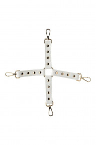 Deze hogtie uit de Blaze Elite collectie is gemaakt van wit kunstleer met goudkleurige metalen details, wat hem een stijlvolle uitstraling geeft.