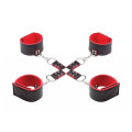 De Ouch! Reversible Collar With Wrist And Ankle Cuffs is een set bestaande uit een halsband met hand- en enkelboeien in de kleuren zwart met rood.