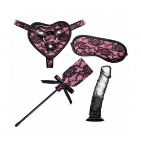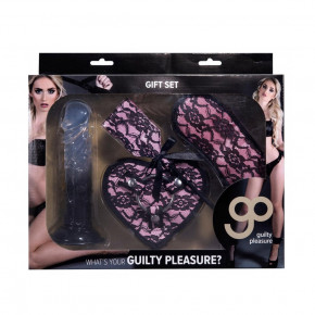 What's your guilty pleasure? Deze Guilty Pleasure geschenkset bestaat uit een hartvormig harnas, een dildo, een oogmasker en een paddle en is roze van kleur, afgewerkt met zwart kant.