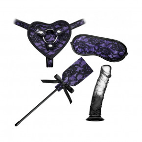 What's your guilty pleasure? Deze Guilty Pleasure geschenkset bestaat uit een hartvormig harnas, een dildo, een oogmasker en een paddle en is paars van kleur, afgewerkt met zwart kant.